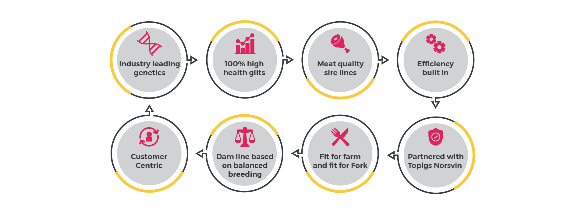 Together JSR Genetics and Topigs Norsvin focus on innovative breeding meaning we can achieve improved genetic progress each year. Our genetic improvement is based on sustainability and efficiency, with a focus on balanced breeding and total feed efficiency, with a reputation for easy care animals.